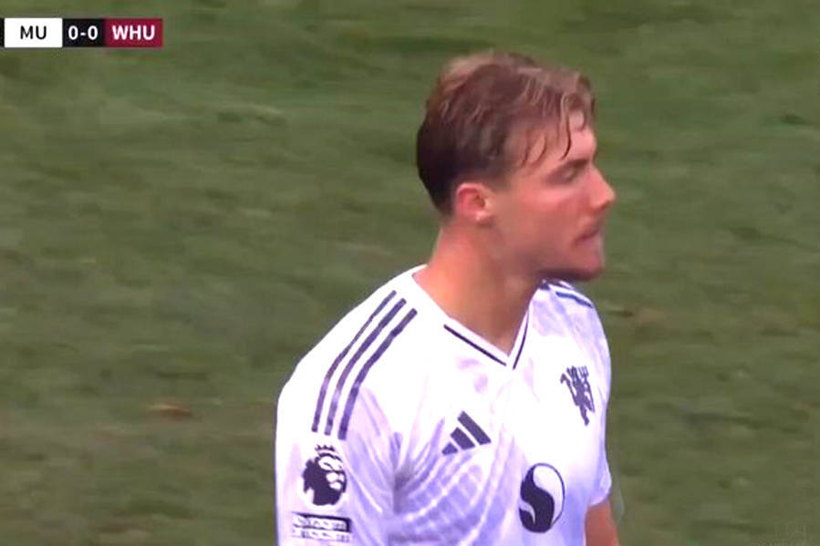 曼联2-1击败西汉姆联的比赛上半场,中锋霍伊伦德有几个灵光一现的瞬间。一开场,他展现了力量、速度和侵略性,接应布鲁诺·费尔南德斯的直塞,左脚射门击中门柱外侧。但他也有问题,另一次12码点附近的左脚射门,直接高出横梁,这让主教练鲁本·阿莫林非常沮丧。
